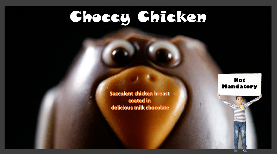 After a conversation in the playground the other day, I decided it was time to scratch the itch that is Choccy Chicken. Years have passed and I’ve never quite got this idea out of my system. Now seemed like as good a time as any.