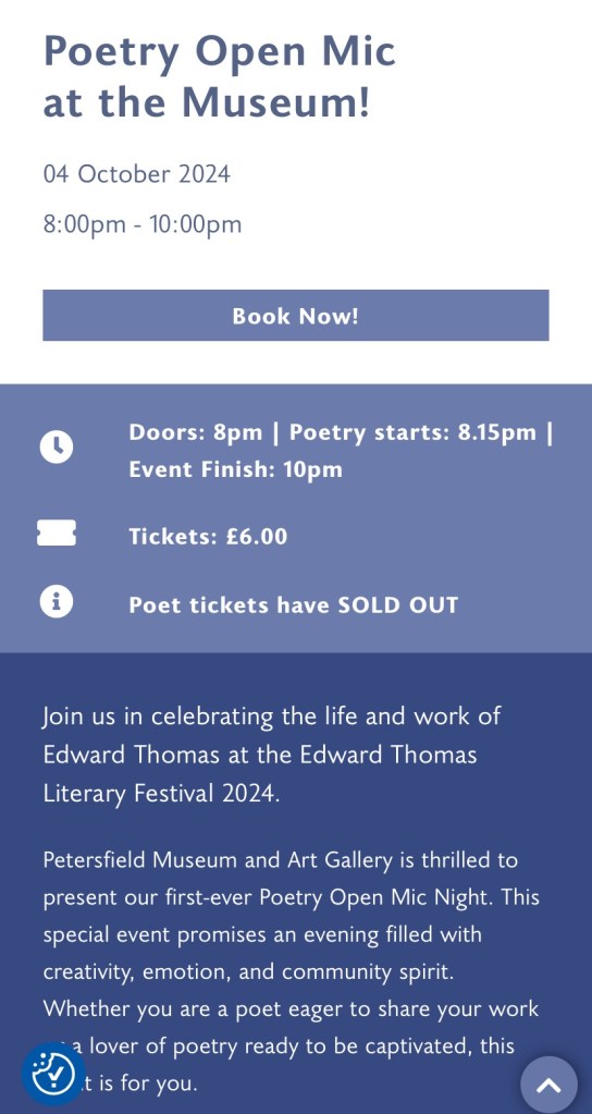 Anyone free this Friday evening? I’m taking part in Petersfield Museum and Art Gallery’s first Poetry Open Mic night, where I will be performing one of my poems. (90% sure which one but happy to take suggestions). You can find details of the event here…
