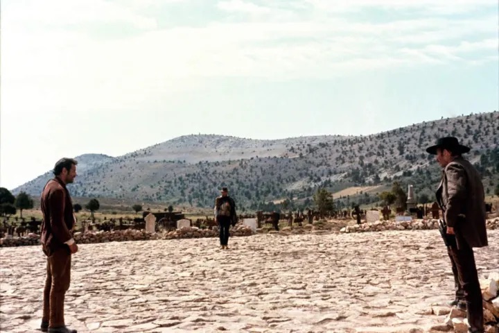 The final standoff between Blondie, Tuco, and Angel Eyes is cinema’s most exquisite exercise in sustained tension because Sergio Leone turns stillness itself into choreography. Three men stand in the vast, hand‑built circular arena of Sad Hill Cemetery, each calculating who will shoot first. As Ennio Morricone’s “Il Triello” escalates, the editing accelerates in perfect synchrony, cutting closer and closer until only eyes fill the screen. Leone stretches time like a noose, then snaps it with gunfire: Blondie kills Angel Eyes cleanly, Tuco discovers his gun is empty, and the unbearable tension resolves in a single breath.