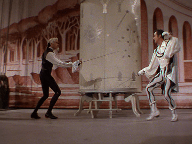 The final duel in Scaramouche is not just extraordinary because of its length but by how the narrative brings us to it. This climactic confrontation is reported to be the longest fencing duel ever captured on film, lasting just over six minutes from first sword contact to last. André Moreau’s entire journey, his grief and gruelling self‑reinvention, the honing of his skills, builds to this with a sense of inevitability. Stewart Granger and Mel Ferrer trained for eight full weeks solely for the sequence, memorising an astonishing 87 individual sword passes and 28 stunts (courtesy IMdB), a level of preparation that echoes the intensity and discipline depicted within the story itself. The duel’s length becomes part of the storytelling: a physical embodiment of years of resentment and preparation boiling to the surface. As the combatants sweep through balconies, staircases, and finally onto the stage of the Théâtre Feydau, the theatre itself becomes a kind of operatic battleground. Granger’s training under European champion Jean Heremans, and the injuries he endured during filming, including a wrenched knee and damaged shoulder, add a grounded, physical authenticity to the on‑screen struggle, heightening the sense that Moreau is fighting with every fibre of his being. More people need to see this film.