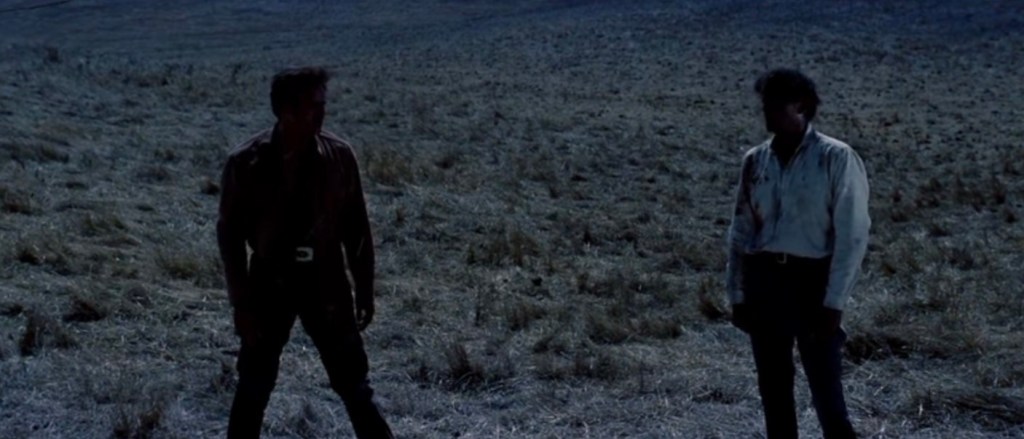 The fistfight between Gregory Peck’s James McKay and Charlton Heston’s Steve Leech in The Big Country stands out because it feels like the moment the film finally lets its simmering tensions boil over. McKay, the quiet outsider who refuses to measure himself by frontier bravado, has spent the story absorbing ridicule and suspicion, and Leech just can’t stand the suggestion that this calm, self‑possessed man could ever be his equal. The sequence carries unusual weight for a 1950s Western, because the film spends so long building toward it, letting small grievances, pride, and unspoken jealousy accumulate until neither man can back down any longer. That slow build-up is why the fight works so well. Even when they finally fight, the scene refuses to rush. Heston and Peck trade blows for nearly five minutes, a length that was striking for the era, with no soundtrack except the grunts and scuffs of the two combatants. They are shot in different ways, but most strikingly in a long shot that shows the darkened brush beyond them and makes them (and their differences) seem very small in the grand scheme of things. Both characters are written as capable, principled men shaped by very different worlds, Hector and Achilles of the West. Their clash feels even more iconic given the combined star power on screen, since the film pairs two of Hollywood’s most commanding presences at the height of their careers. The result is a showdown that feels surprisingly thoughtful, even as it ends up in an exhausted heap on the dusty floor. “All I can say, McKay, is you take a hell of a long time to say goodbye!”