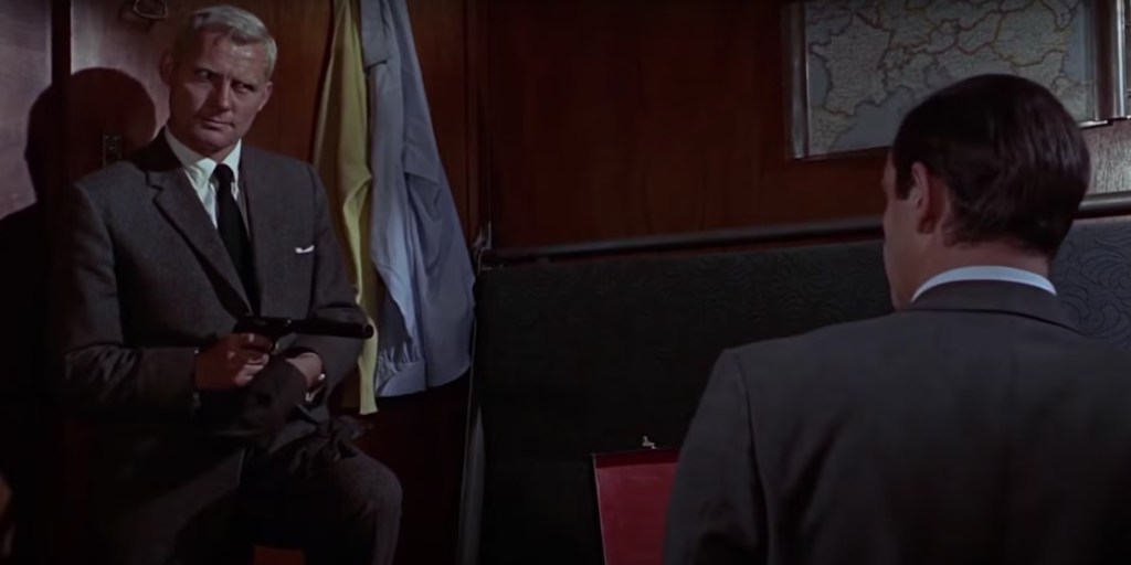 Another train car; another character played by Robert Shaw. But where Gondorff and Lonnegan play their duel with smiles, bluffs, and barbed politeness, the confrontation between James Bond and Red Grant in From Russia with Love feels like a sudden plunge into violence. The two men sit across from each other in the tight compartment of the Orient Express, and the tension doesn’t feel like a game. There is no slow dance of ego here, because Grant is not a man to be provoked into error; he has studied Bond, shadowed him, and positioned himself as the perfect predator. Having said that, it is another fatal flaw, this time greed, that finally gives Bond his opening. The shift from conversation to violence is abrupt, because the film treats the moment as the snapping of a wire. What follows is a fight legendary for its brutality, a desperate struggle in a space barely wide enough for two men to stand. The cramped setting forces their bodies into close quarters, and the resulting brawl is raw and frantic, a world away from quips and elegance. It is this contrast, the suffocating immediacy of fists, garrottes, and sheer survival instinct, that sets the scene apart from a lot of what people associate with the Bond canon, at least pre Daniel Craig. Both actors threw themselves into the preparation for the scene, training with professional wrestlers in Istanbul and leaving real bruises on each other during the encounter.